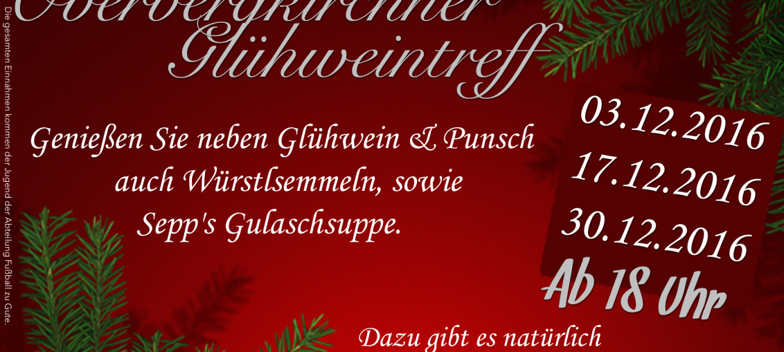 Die Abteilung Fußball lädt im Dezember zum schon fast zur Tradition gewordenen Oberbergkirchner Glühweintreff zu drei Abenden ein. Stimmt euch mit unseren Sportfreunden des SV Oberbergkirchen auf die Advents- und Weihnachtszeit ein. Besucht mit euren Freunden und Familien den Glühweintreff am hinteren Rathausparkplatz. Genießt gemeinsam mit uns die romantische Winteratmosphäre. Es erwarten euch süße Leckereien, Herzhaftes…