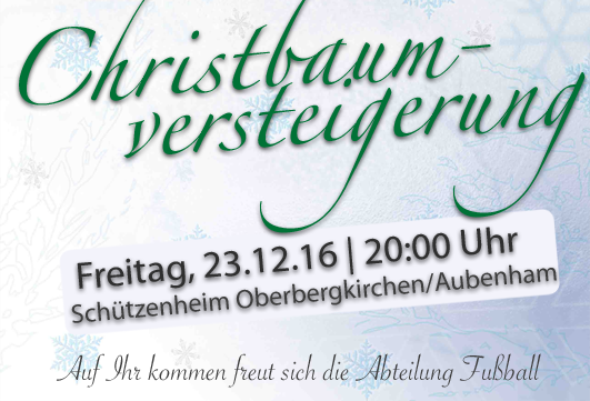 Auch in diesem Jahr wird wieder die traditonelle Christbaumversteigerung im Schützenheim abgehalten. Kurz vor Heilig Abend lädt der Sportverein ’66 Oberbergkirchen wieder zur alljährlichen Versteigerung. Die Vorstandschaft freut sich auf euer Kommen! Freitag, 23. Dezember 2016 Beginn: 20 Uhr Schützenheim Oberbergkirchen/Aubenham Link: Facebook Veranstaltung
